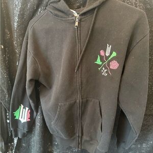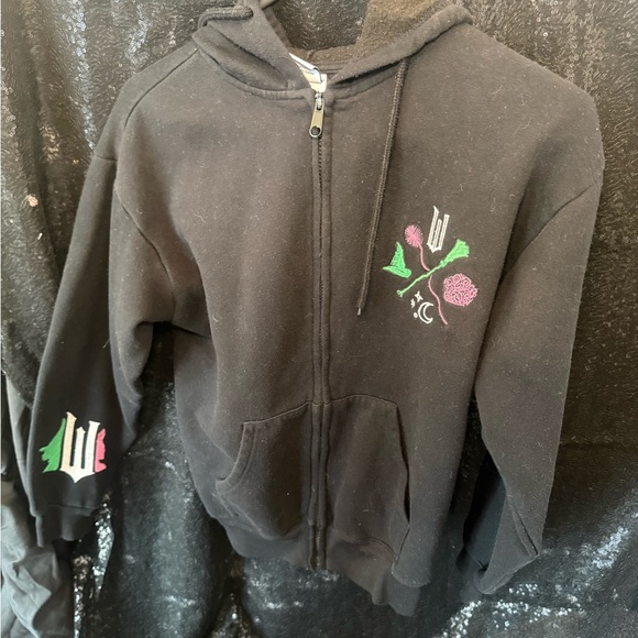 Stylish black hoodie for kids featuring a unique embroidered design. Perfect for keeping your child warm and fashionable.