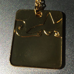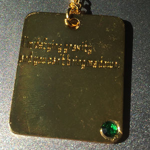 Gold necklace featuring a pendant with Elphaba from Wicked on one side, and the quote "I'm defying gravity and you can't bring me down" with a green gem on the back. Never worn, brand new.