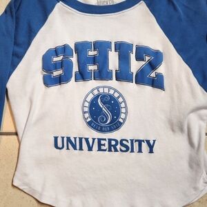 Stylish baseball sleeve top with bold Shiz university print from the Musical movie Wicked. Features blue sleeves and white body.