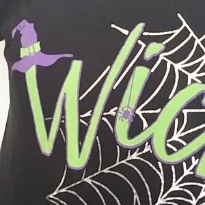 Black T- shirt with short sleeves. Vibrant green spell out," wicked" with a silver spider web and purple spiders, witch's hat and outlining. Very festive and eye catching graphic. In excellent pre-owned condition with no flaws.