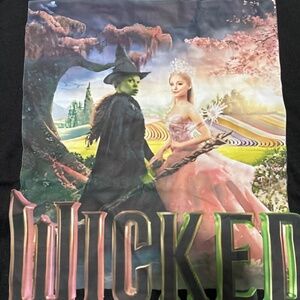 Size large, two girls on front one with black dress and the other lady Arina granda in pink dress the shirt is base on a movie and it is on a black shirt