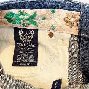 Wicked West Capri Embroidered Jeans Size 6. Embroidery on the inside of the pants belt as well as on the back pocket of the jeans. These are super unique and in great condition. Please see photos for measurements
