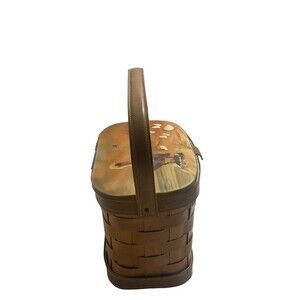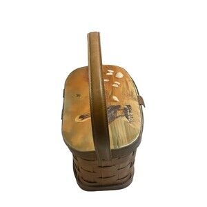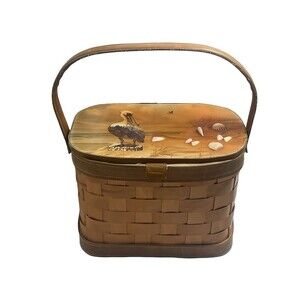 This vintage wicker handbag is a unique find for anyone looking for a one-of-a-kind accessory. It features soft vinyl trim and a possibly decoupaged cover with a pelican design. The handbag is perfect for everyday use, with ample room for your essentials.