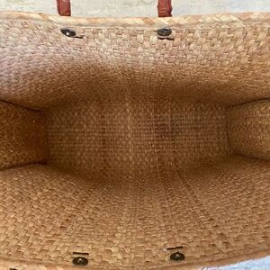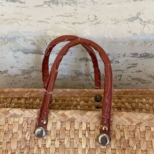 Minor wear on one corner, front has two pockets. Handles are fake leather and have cracked but still function, would be cute wrapped with scarf or rope.