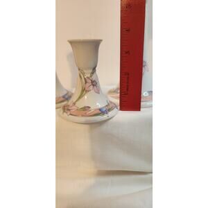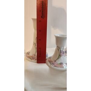 Add vintage charm to your table or shelf with this set of three porcelain candlestick holders from Wicks 'N' Sticks, in the lovely Fiona Apricot pattern made in Japan. Featuring soft pastel florals in pink, lavender, and blue with flowing green leaves, this set has a graceful Art Nouveau feel with a 90s twist.