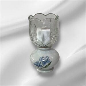 Vintage Wicks N Stikks candle holder. Ceramic and crystal with 2 blue irises on the Ceramic. Measures 5.75in Tall X 2.5in Wide across the crystal top. Very good vintage condition, no chips or cracks or scratches.