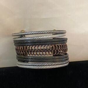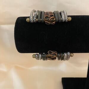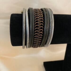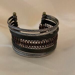 Wide, Bold Rigid Cuff Bracelet made of 3 different types of metal- a silver colored, a bronze colored and a copper colored- all in different designs. The silver has 2 bands of decorative rope like design on both sides. Next is 2 bands of antique bronze with tree branch etching on both sides of the bracelet. Lastly is 2 bands of cooper coils in the middle. There are 2 metal rods on each side of the cuff that hold all of these together. The cuff is rigid and is not easily movable to resize.