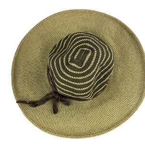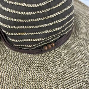 Wide Brim Straw Sun Hat Brown Beige Striped Ribbon Tie Beach Pool Vacation Beach