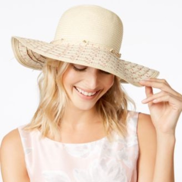 INC Floppy Hats (black/natural or pink/natural) A two-tone brim mimics the look of light peeking through on this shade-giving INC International Concepts floppy hat accented with a band of shiny beads.