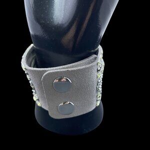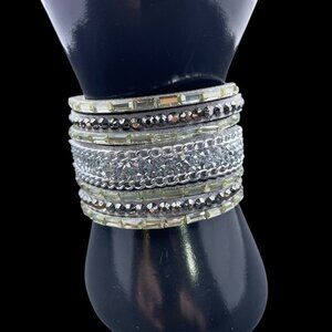 Turn heads with this NWOT wide glam snap cuff bracelet, loaded with layers of sparkle and statement texture. Featuring crystal baguettes, rhinestone studs, faceted beads, and chain details, this silver-tone cuff gives bold luxury vibes on a comfy faux suede band.