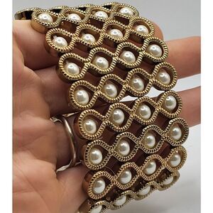 Wide Gold Pearl Stretchy Bangle Bracelet 7in | Materials: imitation pearl, gold metal alloy | Length: 7in | Clasp: stretchy | Signed? no | Excellent vintage condition