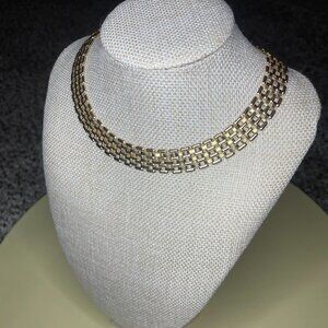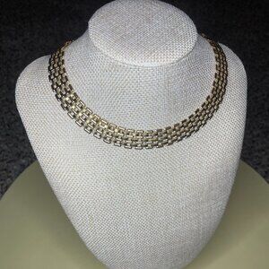 Design: The necklace is constructed from multiple rows of interlocking, flat, rectangular links, creating a solid, wide band appearance.