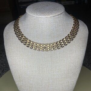 This is a vintage-inspired or retro-style necklace featuring a wide, flexible chain in a gold tone.