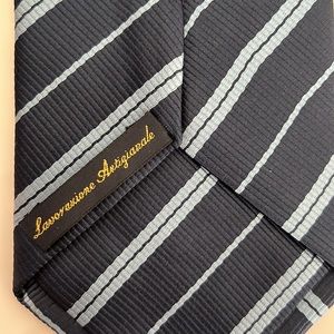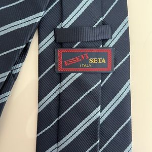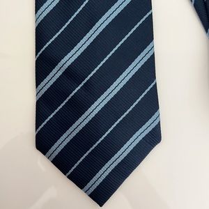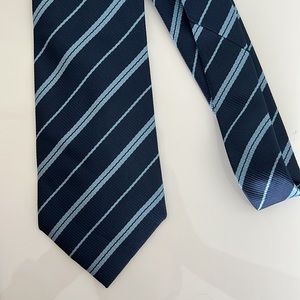 Tie is navy blue with light blue diagonal stripes. Tie is very soft and feels luxurious to touch.
