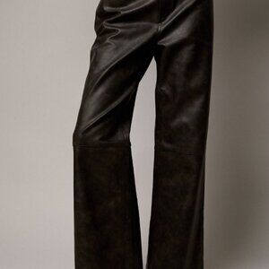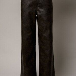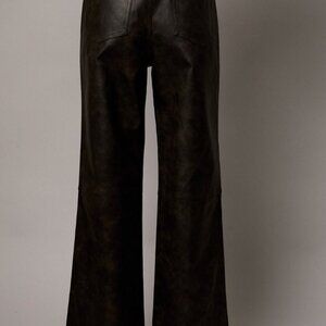 Wide leg faux leather pants crafted in a luxurious dark brown that transitions seamlessly from day to evening wear. The structured silhouette features a classic five-pocket construction with button and zip fly closure, while subtle stitch detailing adds refined dimension to the design. Faux leather construction offers durability and easy maintenance without compromising on that coveted polished aesthetic. Perfect for elevating casual basics or dressing down evening pieces.