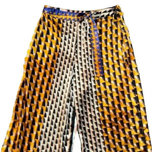 These wide leg pants have a bold, geometric pattern featuring an array of black, white, and mustard yellow shapes. The pattern creates a dynamic, almost kaleidoscopic effect. The design has a modern look with hints of retro style, reminiscent of patterns that were popular in the 60s or 70s.