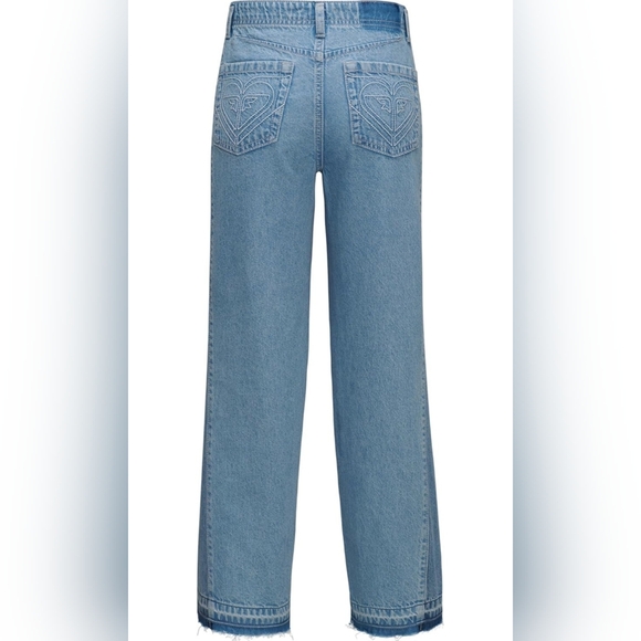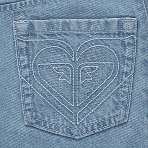 Stylish blue denim jeans with unique heart embroidery on the back pockets.