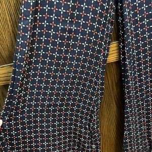 Wide leg slacks that are navy blue with a pink and white pattern. They do have pockets. The zipper is on the left hip with a button as well. Very soft and comfortable.