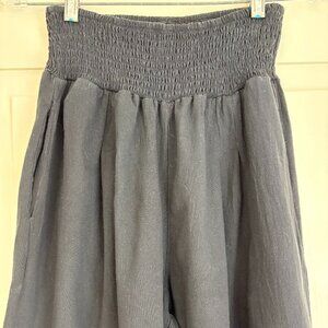 Super comfortable wide leg pull-on pants with a wide smocked and elasticized waistband. Other design features include side seam pockets and front darts to ease in the fullness at the tummy. Classic natural fiber black fabric woven of 80% Cotton and 20% Linen. Size Medium with measurements taken flat and unstretched: Waist 11", Front Rise 13 3/4", Inseam 28", Leg Opening 13 1/2". In Excellent Preowned Condition.