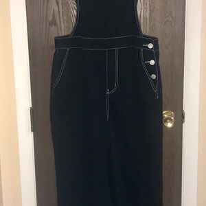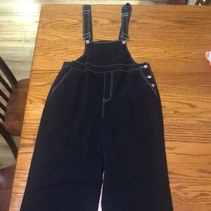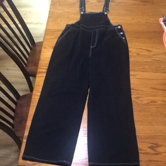 Stylish black denim overalls featuring side button details. Perfect for casual wear. Wide legs. Preowned with gentle wear. No flaws. Waist is 36”. Inseam is 28”