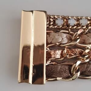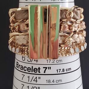 Beautiful bracelet is gold tone with leather braided through the links. Includes a row of faux opals. 1 1/4 inches wide with a strong magnetic clasp. Matches a WHBM necklace that I also have listed. Very good condition with minor scratches on the clasp.