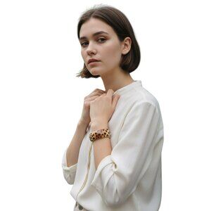 Enhance your style with this wide Lucite bangle featuring a chic animal spots pattern. Perfect for adding a touch of retro safari leopard fashion to your look, this modern vintage bracelet is a versatile accessory.