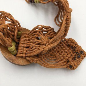 Wide Macrame Woven Belt, Brown Green Wood Buckle & Beads, BOHO 70’s Style