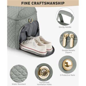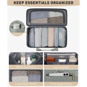 This weekender bag features a ventilated shoe compartment at the side, designed to hold 1-2 pairs of shoes, with breathable holes to prevent odors. The wet/dry separation pocket keeps toiletries and damp towels organized, ensuring your bag stays fresh and dry.