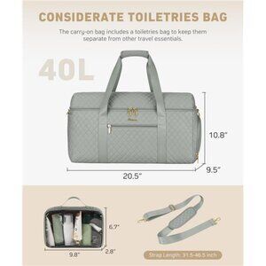Perfect for 3-5 day trips, our large duffle bag for travel measures 20.5"(L) x 9.5"(W) x 10.8"(H). Designed to meet airline carry-on standards, it fits effortlessly in overhead compartments or under the seat. The transparent toiletry bag(9.8" x 2.8" x 6.7") that holds 5-10 travel-sized cosmetics is efficient for security checks.