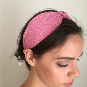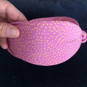 Pink headband with small yellow dots and knot in the middle. Band gets to be about 2.5” at its widest. Hardly worn, maybe once.