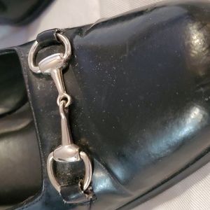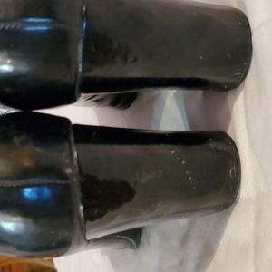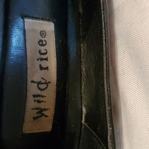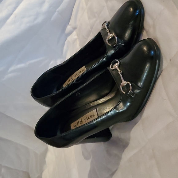 Classic dress pumps by Wild Rive. Size 7. Silver tone bridle bit decoration on patent look heels. 3 inch heels. Excellent used condition. One tiny mar on back of left heel (see pic).