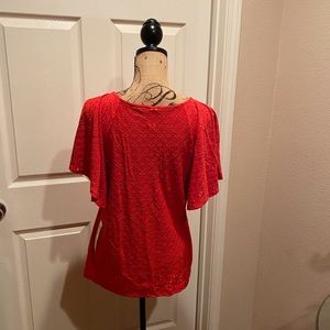 Wide Ruffle sleeve eyelet top with V neckline, relaxed fit. 97% polyester, 3% spandex
