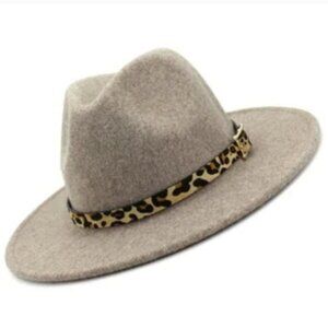 Wide brim oatmeal wool blend fedora with leopard print hatband NWT
