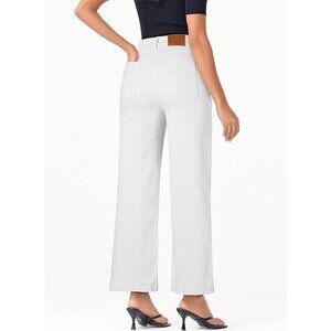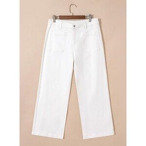 White jeans with a wide/straight leg, front and back patch pockets, and approximately 27 inch "ankle length" inseam. Cotton/polyester/elastane blend.