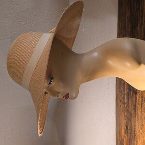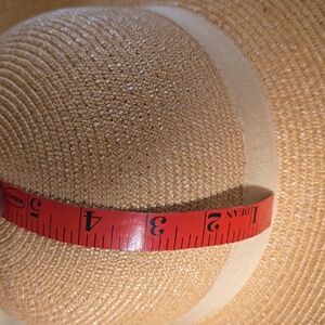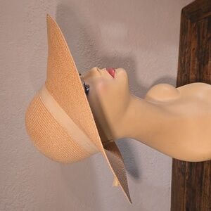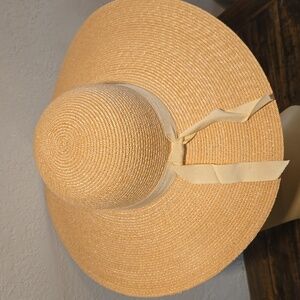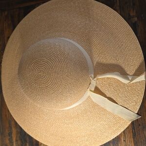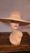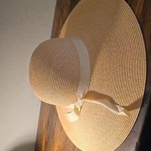 elegant tan wide-brim hat. Perfect for sunny days, and summer dressing this accessory adds a touch of sophistication