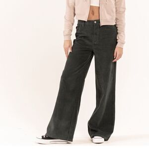 Wide Leg Corduroy Pants. Belt loop waist. Button closure paired with zipper fly. All over corduroy. Rounded hand pockets. Back patch pockets. Wide leg fit. Approx. inseam: 31". 100% Cotton.