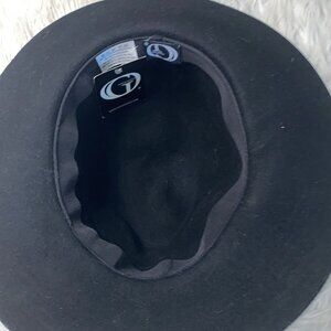 Wide-brimmed hat in black with a red ribbon around Giovanni's head.