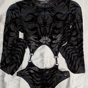 Sheer mesh construction with a flocked design, long sleeves with thumbholes, cutouts across the waist with clasp hook closures, and snap buttons at the gusset.
