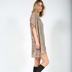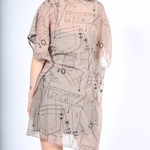 These brand new Widow tunics are printed with a custom atelier pattern makers pattern design that incorporates the Widow logo. Perfect for any designers or pattern makers out there. They are dead stock from when Widow was a division of Lip Service. Tan with black print. Tunic has no liner and is totally sheer. Model is wearing a slip. nos.