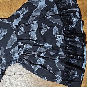 Dolls Kill brand Widow 'deadly echo' flying vampire bat print mini chiffon babydoll dress. Lace trim at neck and shoulders, as well as near hem. Scoop neck with a little black bow. Frilly / puffy shoulders. It's adorable with a petticoat for a gothic lolita look. Size XS. NWT.