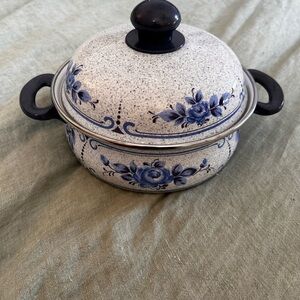 Beautiful ceramic pot with blue floral design. Comes with a matching lid. Perfect for cooking or serving. Wiener Email 6 Quart Enamel Ware Stock Pot Rare (Austria) Excellent Condition