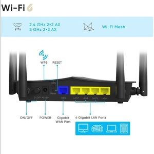 【Dual-Band Wi-Fi 6 router & 5 Gigabit Ethernet ports】The latest generation of Wi-Fi 6 technology fully utilizes both 2.4 GHz and 5 GHz bands,achieves faster speeds up to 1.8Gbps,which provides up to 4x greater network capacity and efficiency in traffic-dense environments. This router comes with 1x Gigabit WAN Port,4X Gigabit LAN Ports