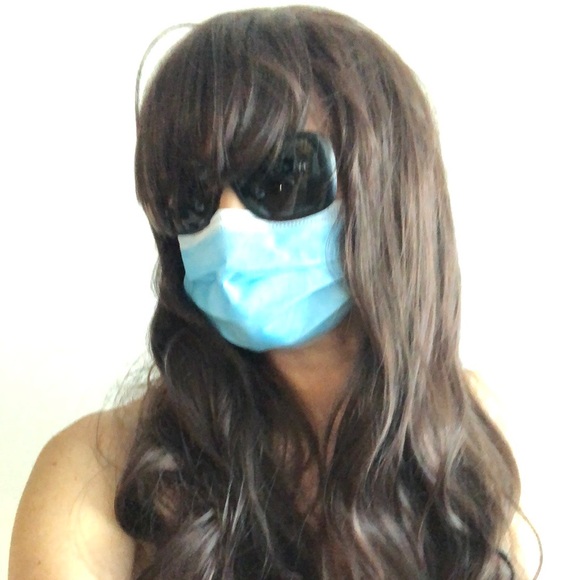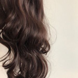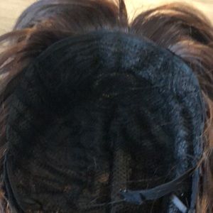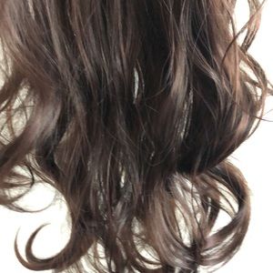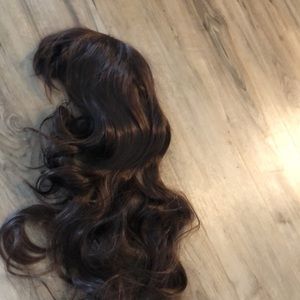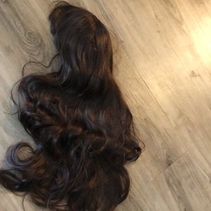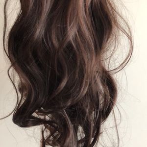 High quality wig human hair mix with 15% high quality synthetic .Never used . Long slightly curly .adjusted strips, brown