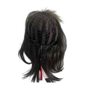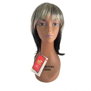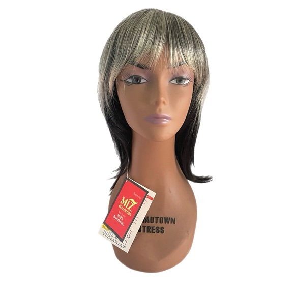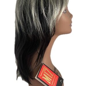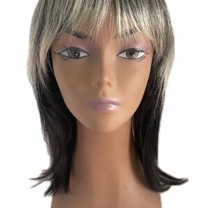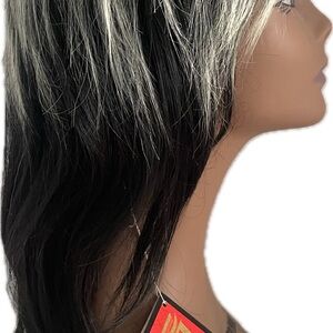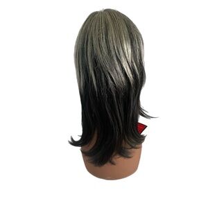 Check out this brand new wig with tags! It features stylish blonde highlights on top and sleek black underneath, complete with trendy bangs.