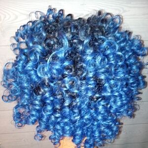 The Dream Wig by Sis kinky curl texture easy to style. Ombre ocean blue color synthetic hair lustrous natural hair look, adjustable breathable open weft cap construction. stretch 12" inch finish hair length.