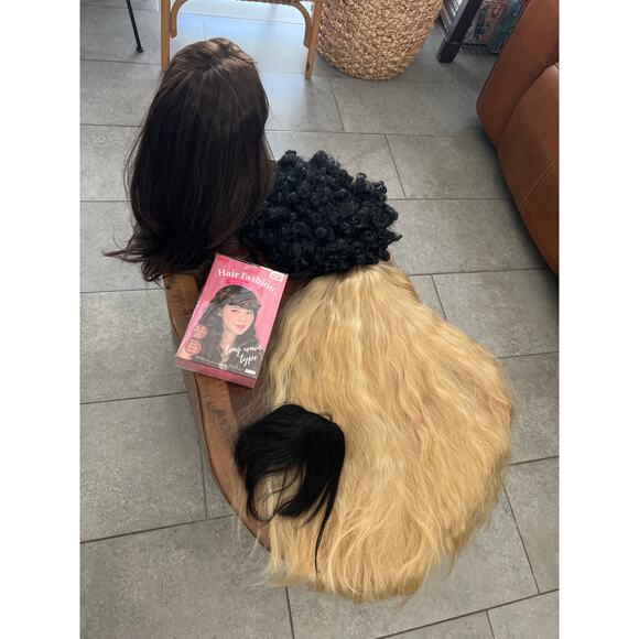 Get ready to transform your look with this amazing lot of 5 wigs! Afro, blond, brunette and black hair bangs clip on. Perfect for cosplay events, costume parties, or just experimenting with different styles. Each wig is made with high-quality synthetic fibers that look and feel like real hair.