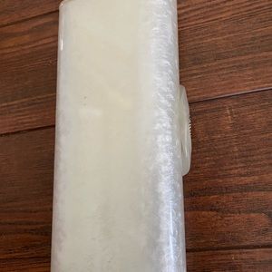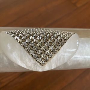Wilardy rare vintage lucite clutch with beautiful rhinestone detail. Pearl colored. Mirror inside. Snaps closed securely. Fun to carry! Small scratches from use, but otherwise still a great rare purse to add to your collection. I’ve personally owned it 40 years. It belonged to my grandmother who had a flair for fashion.