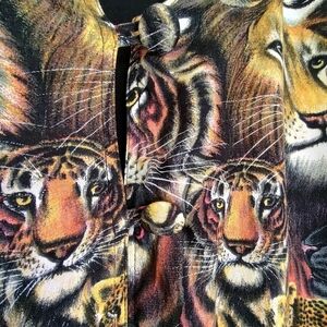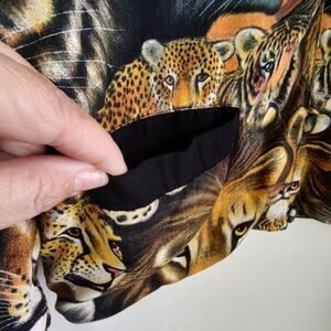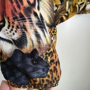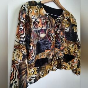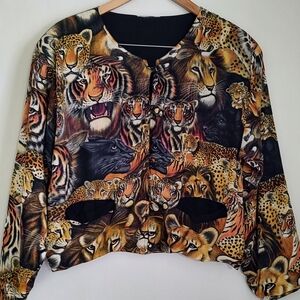 Vibrant jacket featuring a wild animal print. Includes lions, tigers, and leopards. Perfect for making a bold statement. Boxy fit, Double layered rayon fabric, Black lining and small shoulder pads. Good pre-owned condition except brand name tag was cut off and the stitching to the right of where the tag was needs small repair. I didn't notice a hole or any damage there.