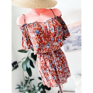 Like a page from a bohemian daydream, this flowy floral off-shoulder romper carries you effortlessly from golden afternoons to twilight wanderings. The soft terracotta base, kissed with vibrant blue and ivory blossoms, feels like wildflowers scattered across a sunlit meadow.