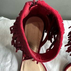 Elevate your style with these striking red heels from DIVA Lounge, featuring a chic fringe design and a high heel silhouette. The open toe and single strap across the toes add a modern touch, while the back zipper closure ensures a secure fit. Perfect for making a bold statement at any event.